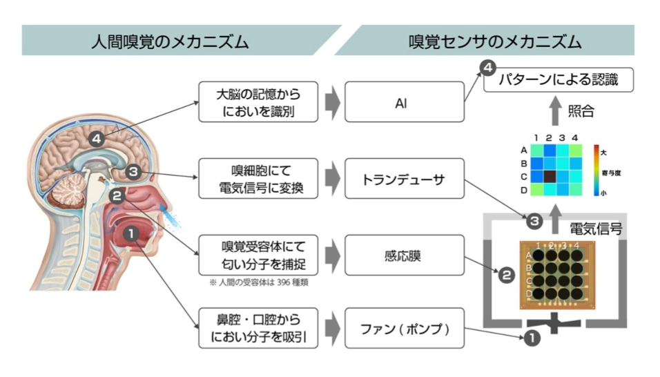 人工嗅覚は、その名のとおり人間嗅覚のメカニズムを基にしています。人は、最初に鼻腔からにおい分子を吸引して、それを嗅覚受容体で捉えて嗅細胞で電気信号に変換しています。その信号を脳に送ることで記憶と参照し、においを識別していると考えられています。当社のセンサも同様のメカニズムで、「①ファン」で吸引されたにおい分子を、「②感応膜」に吸着させ、「③トランデューサ」で電気信号に変換したうえで、「④AI」によるパターン認識を経て、においを識別します。