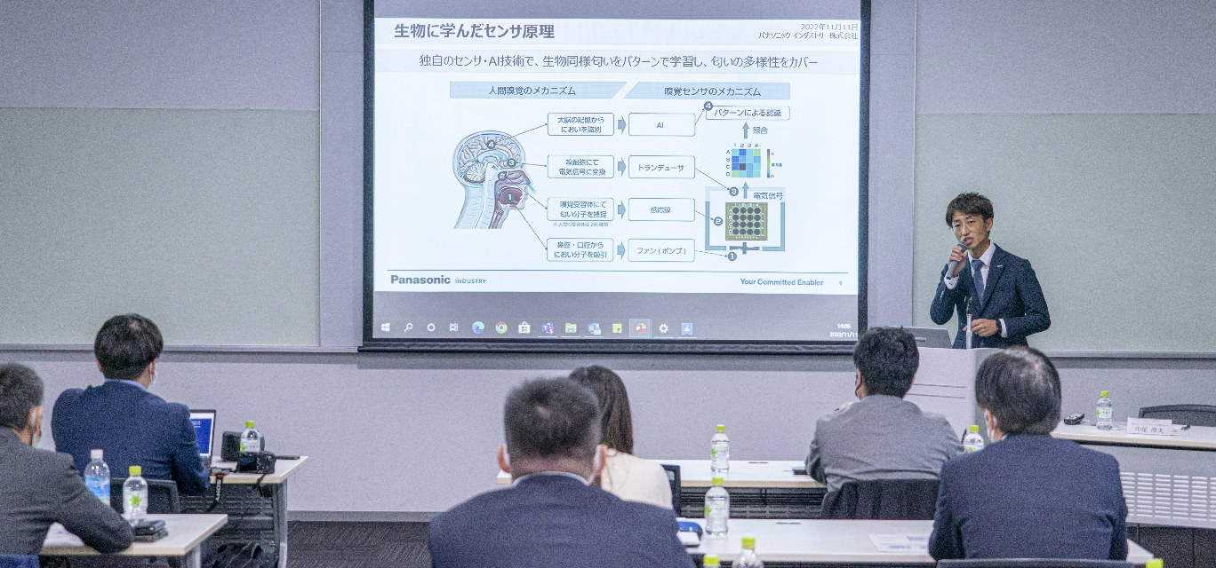 嗅覚のデジタル化が極めて困難だとされてきた理由は、40万種類に及ぶにおい成分の膨大さと、味との比較で言えば1000分の1にも満たない、におい物質の濃度の低さ。これを的確にセンシングして電気信号に変え、パターン認識して人の嗅覚に迫る、さらにその先へ――。さまざまなセンサの開発、実用化に取り組んできたパナソニック インダストリーは、"五感で最後のデジタル化”とされるフロンティア領域に挑んでいます。その一歩目が、2022年11月に公開した「人工嗅覚システム」です。