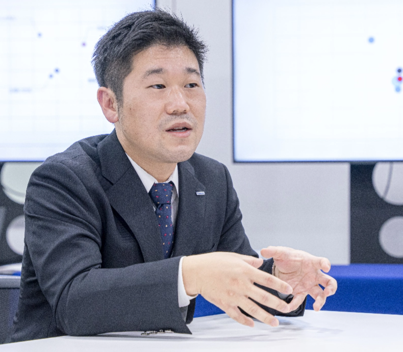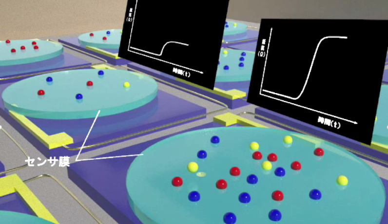 この嗅覚センサメカニズムの肝と言えるのが、高分子材料と導電性カーボンナノ粒子の混合物で構成される独自開発した感応膜です。径1mmの感応膜を4列×4列に配置した16チャンネルの小さなセンサチップが、においを捉えて電気信号に変換します。例えば、一般的なガスセンサは1種類のガスしか検知できませんが、人工嗅覚センサは、一つのデバイスで多様なにおいの状態を判別できます。プロジェクトマネージャーの瓜生幸嗣は「東京大学ほかと共同研究をした『呼気による個人の識別』で、当社センサで取得した対象者の呼気データとにおいの違いから、個人認証が可能だと実証しました。あくまでも一つの応用例で、実用化に向けた課題は多いですが、人工嗅覚がヒトでは不可能な領域に踏み込んだという意味で象徴的な結果ではないかと考えています」と手応えを語ります。