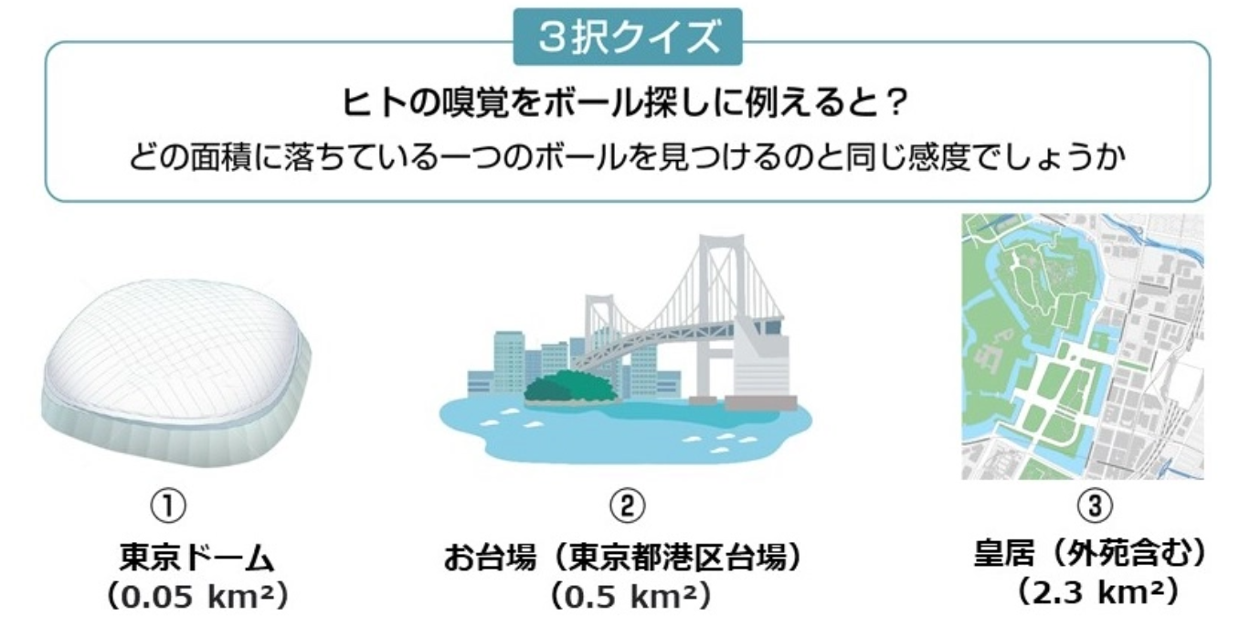 人の嗅覚とは、どのくらい薄いにおいをかぎ分けられるのか。例えば、1種のにおいをボールとすると、どのくらいの広さから見つけるのと同じ感度でしょうか。答えは③の皇居の広さ。それくらい薄いにおいも判別できるのが、人の嗅覚レベルです。におい物質の濃度の薄さは、味を構成する分子濃度と比較をしてみると、その差は歴然。味の分子濃度1%に対して、においの分子濃度はその100分の1(1ppm)~1兆分の1(1ppt)と非常にわずかな物質量です。