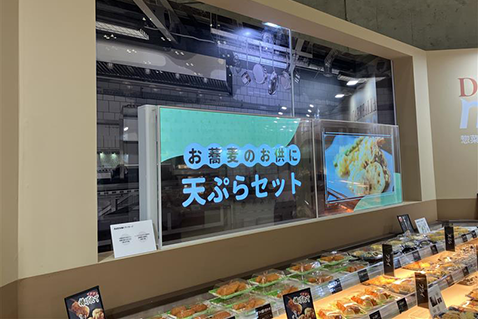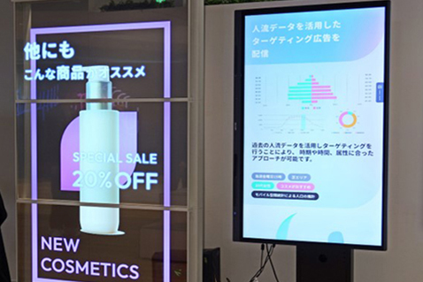 カメラでの個人認証による性別・年代に合わせた広告映像コンテンツを投影するための機器に、透明ディスプレイが採用されました。