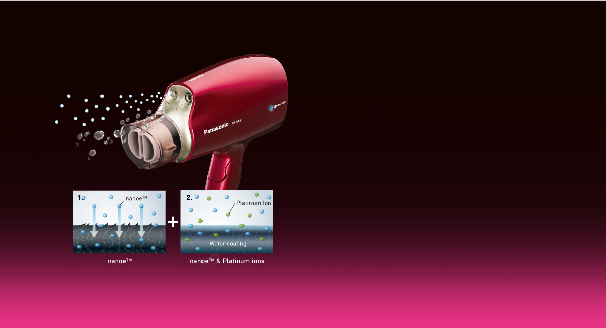 nanoe ជ្រាបចូលក្នុងស្រទាប់សក់ជួយផ្ដលនិងរក្សាតុល្យភាពសំណើមដល់សក់ ស្របពេលដែលអ៊ីយ៉ុងផ្លាកទីនស្រោបស្រទាប់សក់ខាងក្រៅនិងជួយបន្ដឹងសរសៃសក់។ ទន្ទឹមនឹងនេះ អ៊ីយ៉ុងទ្វេរ មានមុខងារជួយបង្កើនសំណើម ដើម្បីជួយឱ្យសក់មានស្រស់ស្អាត។1. nanoe™បញ្ចេញសំណើមជ្រាបចូលជ្រៅទៅដល់បណ្ដូលសក់។* អ៊ីយ៉ុងផ្លាទីនគឺជាអ៊ីយ៉ុងដែលបញ្ចេញដោយអេឡិចត្រូតផ្លាទីន។