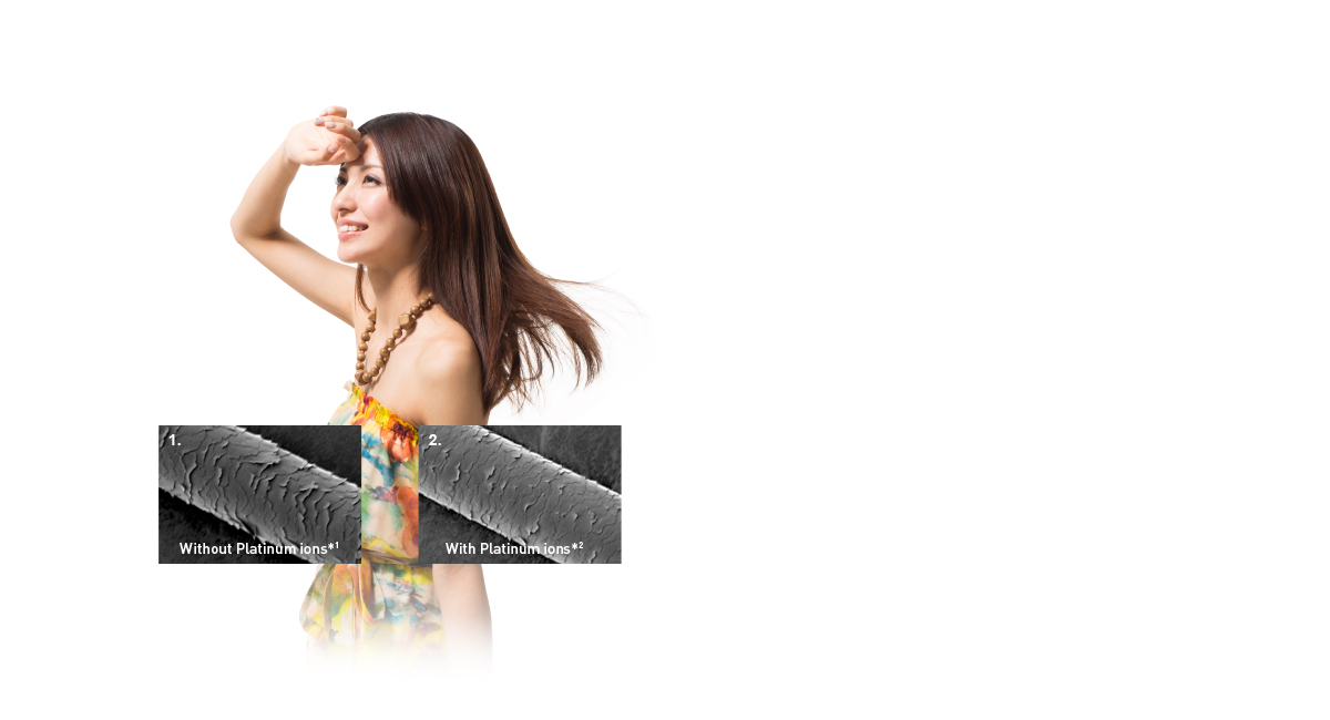 កាំរស្មី UV(អ៊ុលត្រាវិយូឡេត) អាចធ្វើឱ្យស្រទាប់សក់ខាងក្រៅងាយខូច។ អ៊ីយ៉ុងផ្លាទីន ជ្រាបចូលទៅក្នុងសក់ដែលការពារ មិនឱ្យសក់ខូច។រូបភាព៖ ស្ថានភាពសក់ បន្ទាប់ពីត្រូវកាំរស្មីអ៊ុលត្រាវិយូឡេតរយៈពេល៦ខែ។1. មិនមានអ៊ីយ៉ុងផ្លាទីន*¹មើលមិនឃើញពីការរបកស្រទាប់សក់ខាងក្រៅយ៉ាងច្បាស់ នៅពេលមិនប្រើអ៊ីយ៉ុងផ្លាទីន។2. មានអ៊ីយ៉ុងផ្លាទីន*²មិនមានការរបកស្រទាប់សក់ខាងក្រៅយ៉ាងច្បាស់ នៅពេលប្រើអ៊ីយ៉ុងផ្លាទីន។
