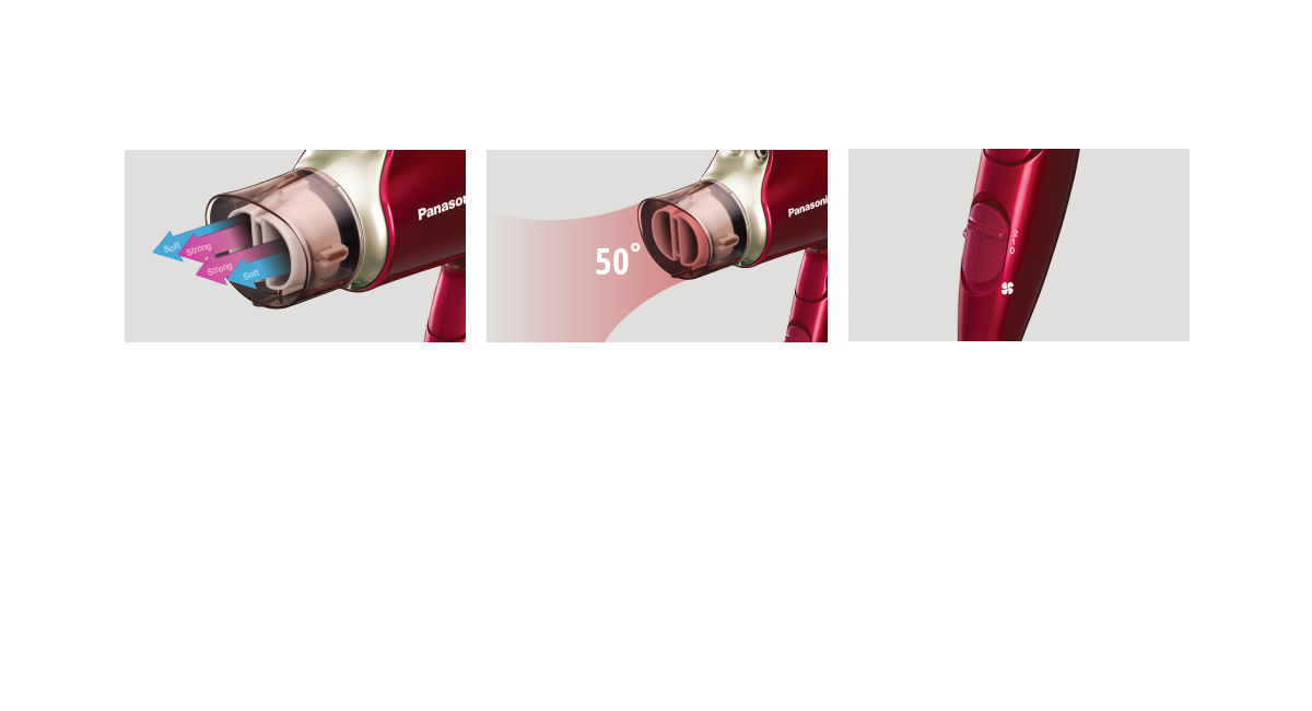 ក្បាលភ្ជាប់ផ្លុំសម្ងួតសក់រហ័សដ៏ពិសេសរបស់ Panasonic បង្កើតចរន្ដខ្យល់កម្រិតខ្ពស់ និងខ្សោយដើម្បីជួយឱ្យ សក់ញែកចេញពីគ្នាក្នុងការបង្កើនផ្ទៃរបស់សក់សម្រាប់ សម្ងួតបានយ៉ាងរហ័ស។