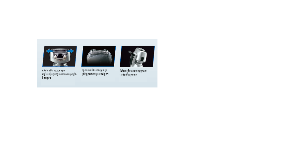 • ក្បាលកោរអាចតម្រឹមបានគ្រប់កន្លែង• មុខកាត់វិល 3 អាចបែរគ្រប់ទិស• មុខខាងក្នុង 30 ដឺក្រេមានបច្ចេកវិទ្យាnano• ម៉ូទ័រលីនេអ៊ែរ 13,000 cpm• មុខងារជ្រើសរើសរង្វិល• មុខកាត់កណ្ដាលតម្រឹមឌុប• មុខងារសម្អាតដោយសំឡេងរំញ័រ• អេក្រង់ LED• ពន្លឺបង្ហាញសញ្ញា 2 ដំណាក់កាល [កម្រិតថ្មទាប]• អំពូលភ្លើងបង្ហាញស្ថានភាពសាកថ្ម• រូបរាងងាយស្រួលប្រើ• ម៉ាស៊ីនតម្រឹមលោតចេញក្រៅ• ដំណើរការមាន/ឥតខ្សែ• តង់ស្យុងសកល• កាបូប