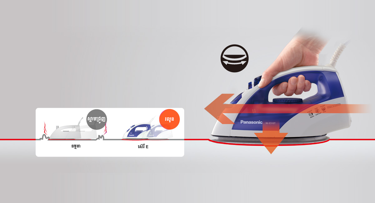 រូបរាងពិសេសរបស់បាតការពារសាច់ក្រណាត់មិនឱ្យប្រទាក់ជ្រួញ ដូច្នេះការអ៊ុតមានភាពងាយស្រួល និងរីករាយ!