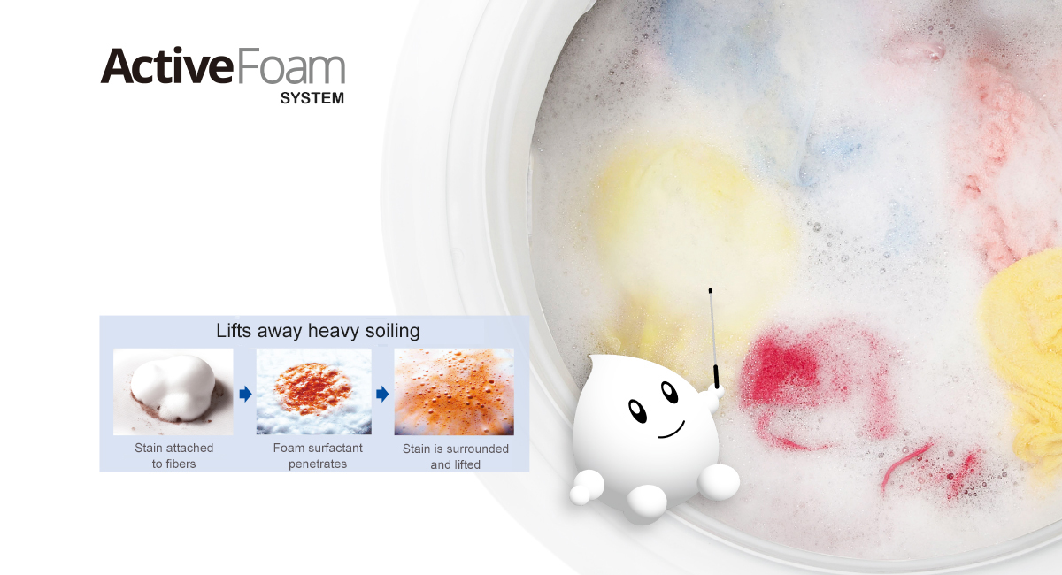 The ActiveFoam System turns detergent into fine foam from the beginning of the wash cycle. This highly concentrated foam completely surrounds clothes and attaches to dirt, which is then lifted away with powerful water flow. Even stubborn stains are quickly and easily washed away with the ActiveFoam System.