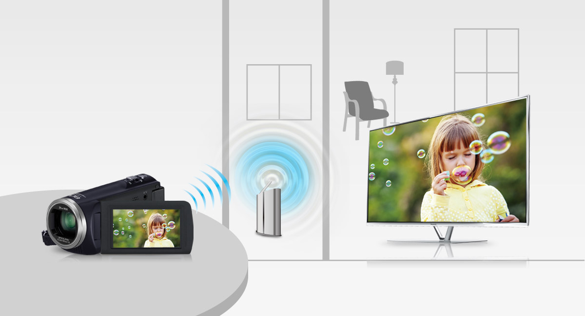 بدون أي إعدادات محيرة، نظام الاتصال قريب المدى (NFC) يسمح لك بتوصيل هاتف ذكي أو جهاز لوحي بكاميرا الفيديو بلمسة واحدة.