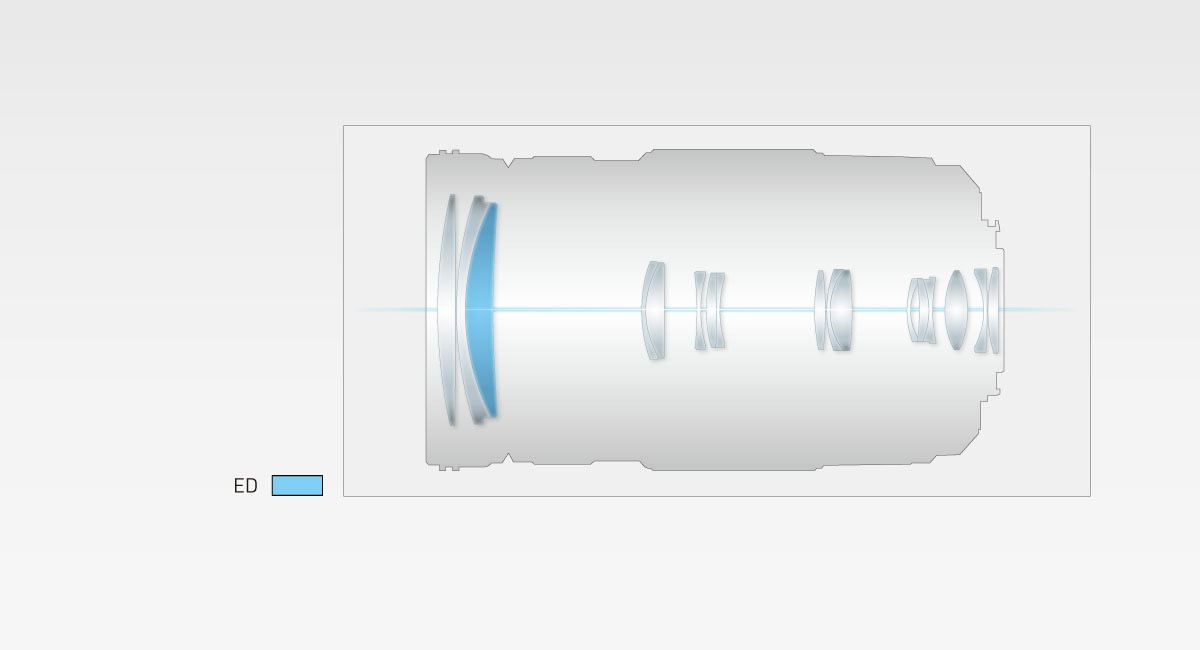 • عدسة ED في أول مجموعة عدسات لأداء بصري متفوق عن طريق التخلص من الانحرافات اللونية في كامل مجال التقريب