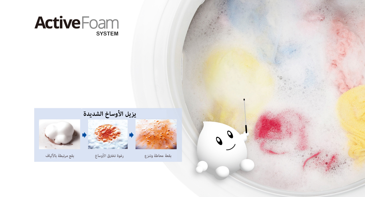 يحول نظام الرغوة الفعالة ActiveFoam المنظف إلى رغوة دقيقة من بداية دورة الغسيل. إذ تحيط الرغوة عالية التركيز الملابس تمامًا وتلتصق بالأوساخ التي يتم بعد ذلك فصلها من خلال تدفق المياه القوي. وحتى الأوساخ الصعبة يتم التخلص منها بمنتهى السرعة والسهولة مع نظام الرغوة الفعالة ActiveFoam.