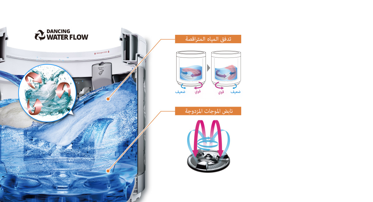 تنتج عن دمج التقنيتين الحصريتين، تدفق المياه المتراقصة ونابض الموجات المزدوجة، تدفقات مياه قوية ومتعددة الاتجاهات. إذ تحرك تدفقات المياه الملابس بشكل كافٍ لضمان عملية غسيل نظيفة ومتسقة.