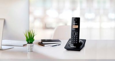 Teléfono inalámbrico con funciones simples con una pantalla LCD de 1.4 pulgadas en color ámbar. Tiene una base compacta y cuenta con la función de modo Eco inteligente.