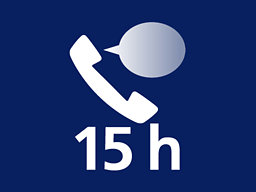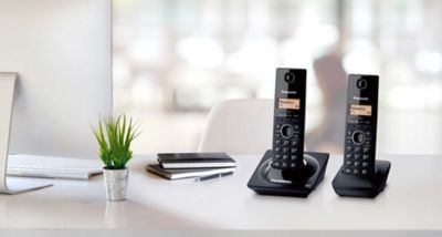 Teléfono inalámbrico con funciones simples con una pantalla LCD de 1.4 pulgadas en color ámbar. Tiene una base compacta y cuenta con la función de modo Eco inteligente.