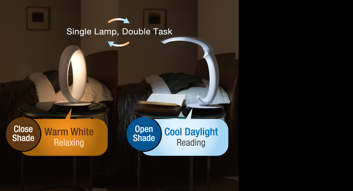 Close the shade to relax with a soft, Warm White colored light. Open the shade for a bright, Cool Daylight colored light, suitable for reading.