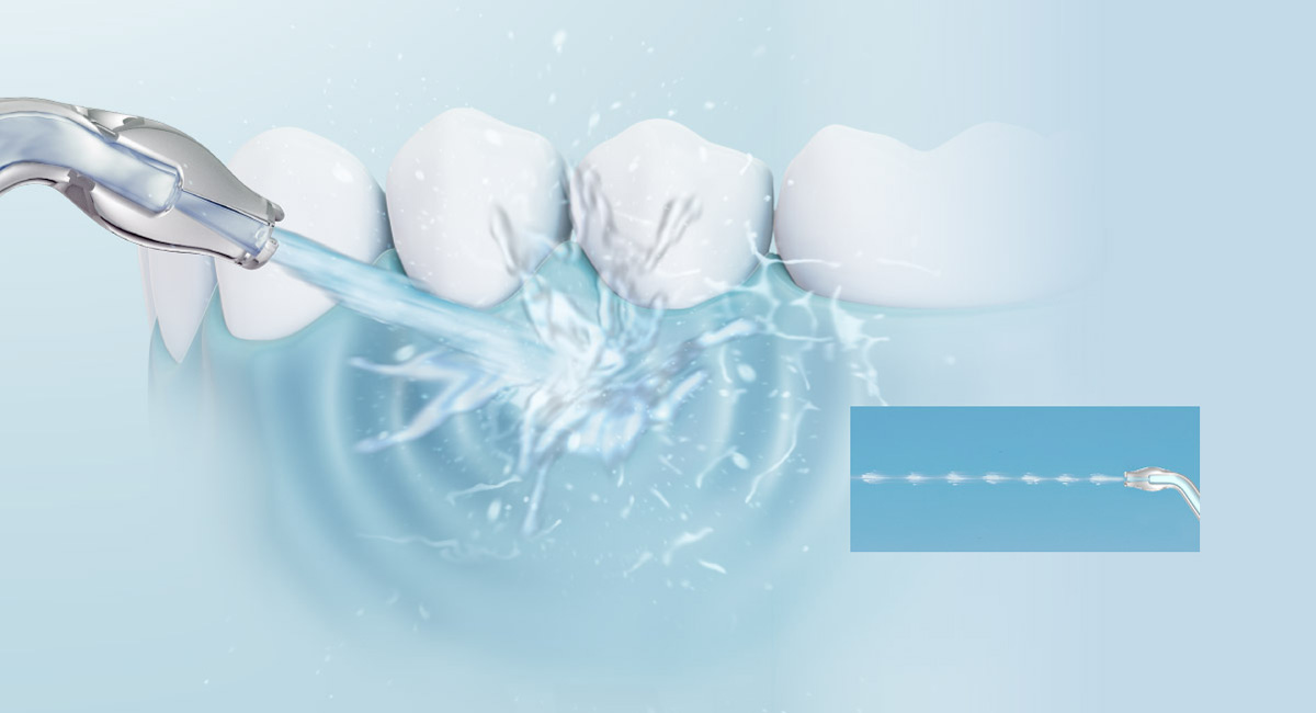 Water jet with ultrasonic technology removes the bacteria in periodontal pockets that cause periodontal disease.