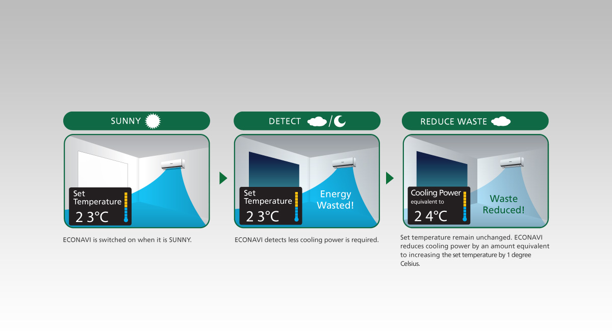 Where smart meets cool – Using Intelligent Eco Sensors, the ECONAVI Air Conditioner consumes less energy and focuses cooling over on areas that matter the results lower electricity usage and greater costing saving.