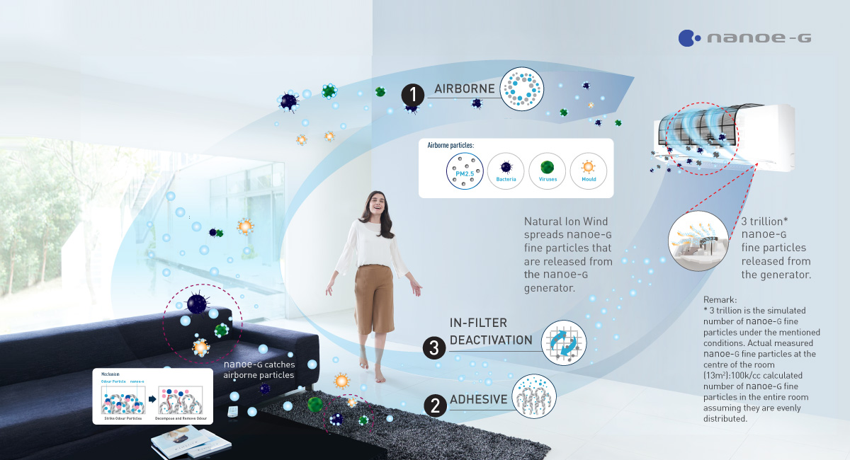 SKYWING (Radiant Cooling & Direct Cooling), Inverter, nanoe-G with dust sensor, XTRA QUIET, R410A Refrigerant, 5-Star Energy Rating.
