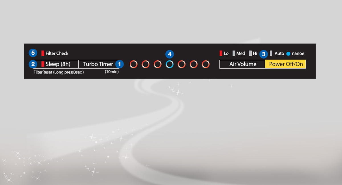 The dirt sensor detects dirt in the air and notifies with the clean sign. The clean sign can be switched off by pressing the button of [Sleep(8h)] and [Air Volume] simultaneously for about 3 seconds.