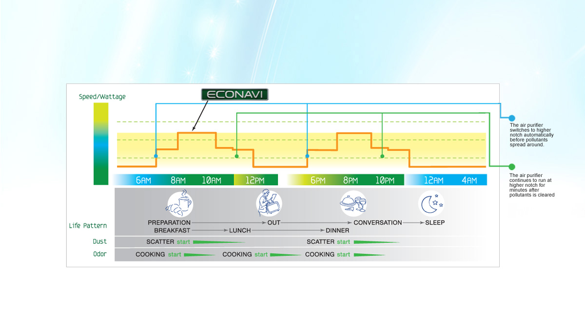 With ECONAVI, the air purifier operates automatically before pollutants spread