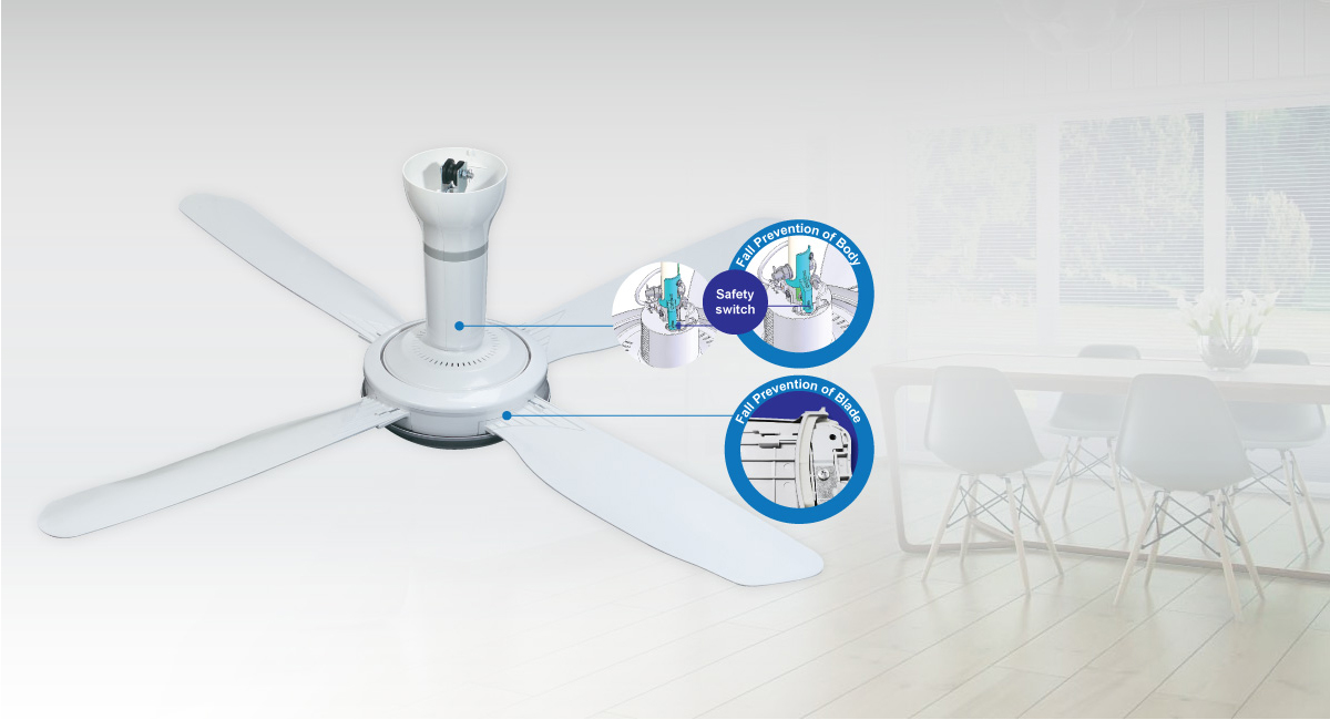 A fall prevention plate is installed on the blade to prevent fan blade to detach and dropping from the ceiling in case it damages.