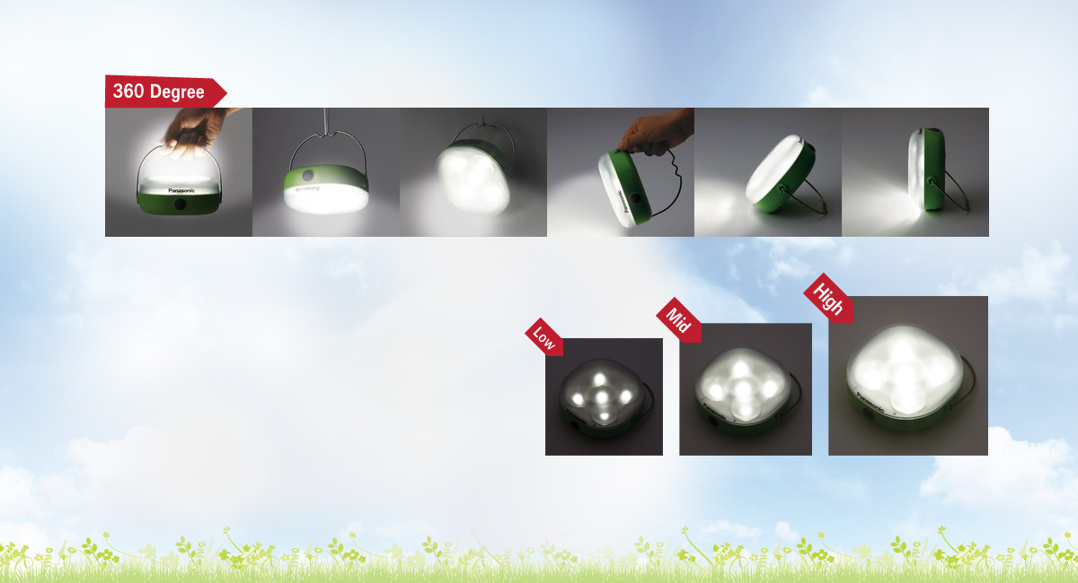 The lantern contains five LEDs and is designed to emit light 360 degrees. This wide emission angle makes it suitable for use in everyday life such as at family dinners and for children studying. With a touch of button on the lantern, the brightness can be adjusted between High (100 lx), Medium (40 lx) and Low (6 lx). The lantern has a handle, which allows for flexibility in setting up the light. It can be hung in the room, placed on a table or carried with the user.