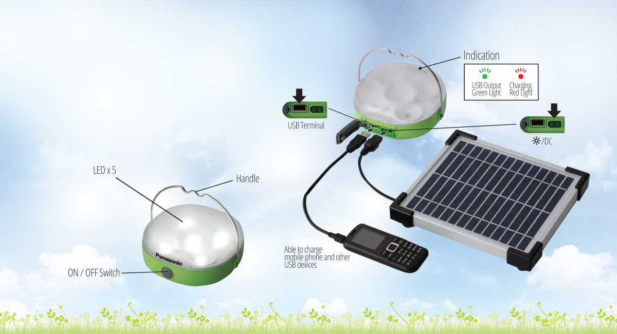 The solar lantern, fully rechargeable in six hours and emitting light 360 degrees, is convenient and practical as a light source as well as a power source in areas without electricity.