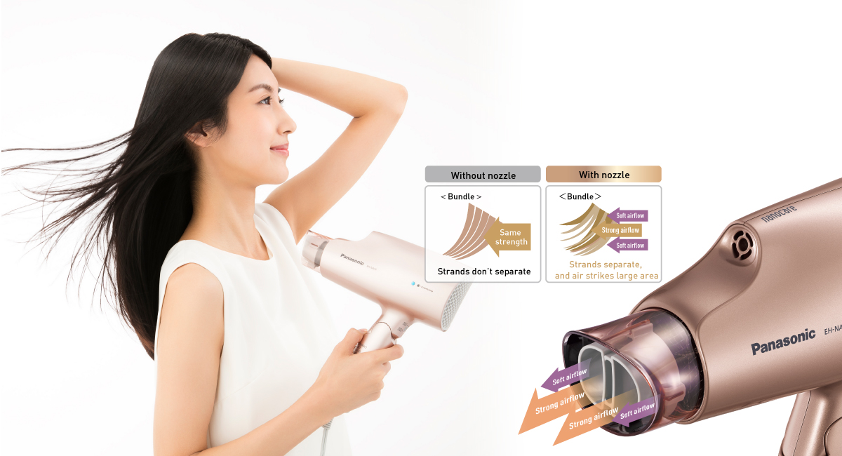 Panasonic’s unique Quick-dry Nozzle separates hair strands for fast drying. It takes more