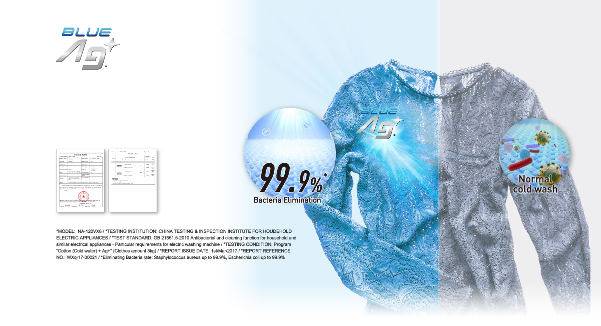 Blue Ag+ cold wash hygiene for bacteria elimination and