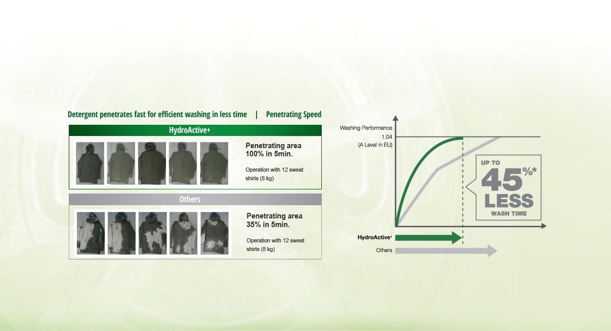 HydroActive+ uses five multi-directional showers to ensure the most efficient washing performance. These showers can achieve fast penetration in less time and energy saving.