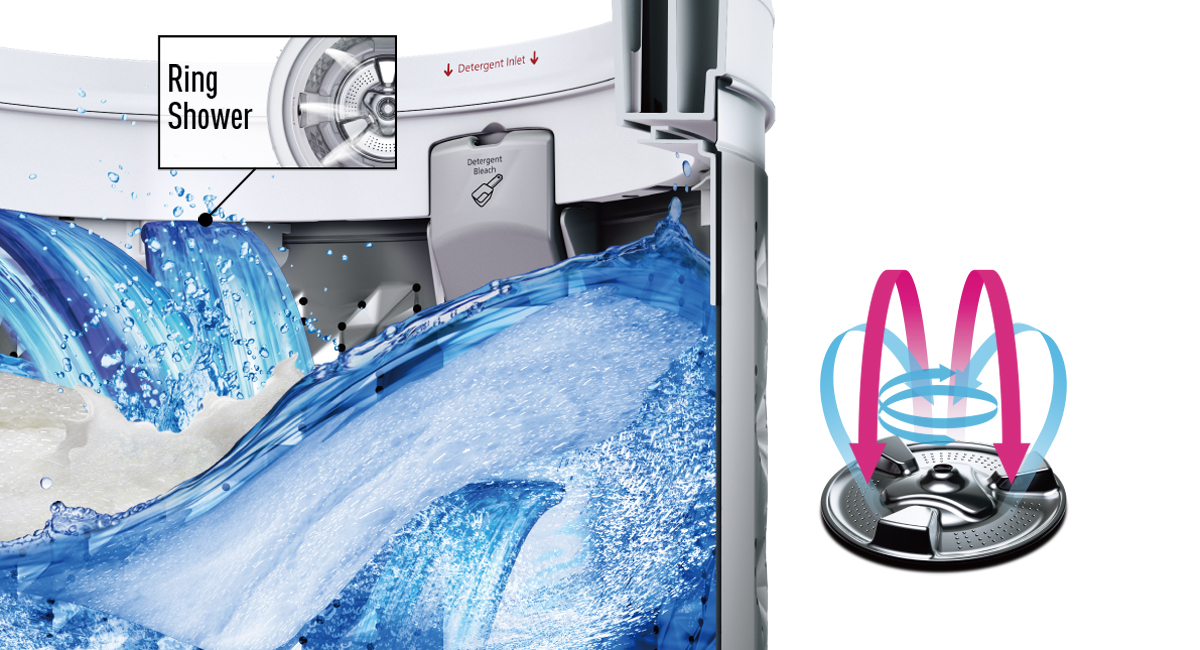 Separate inner and outer fins generate not only horizontal & vertical,but also “In to Out” flows. As a result, clothes in every part of the tub are thoroughly washed.