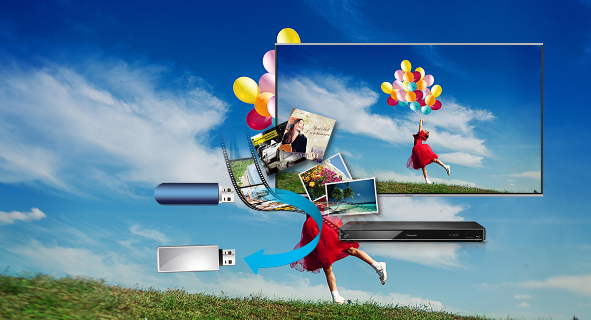 Simply insert two USB memory sticks simultaneously, to share photos(JPEG, MPO), movies(AVCHD 3D,SD-VIDEO, AVI,MKV,WMV,MP4,M4v,FLV, RMVB*) and music(MP3,AAC,WMA,FLAC,WAV) data between them.