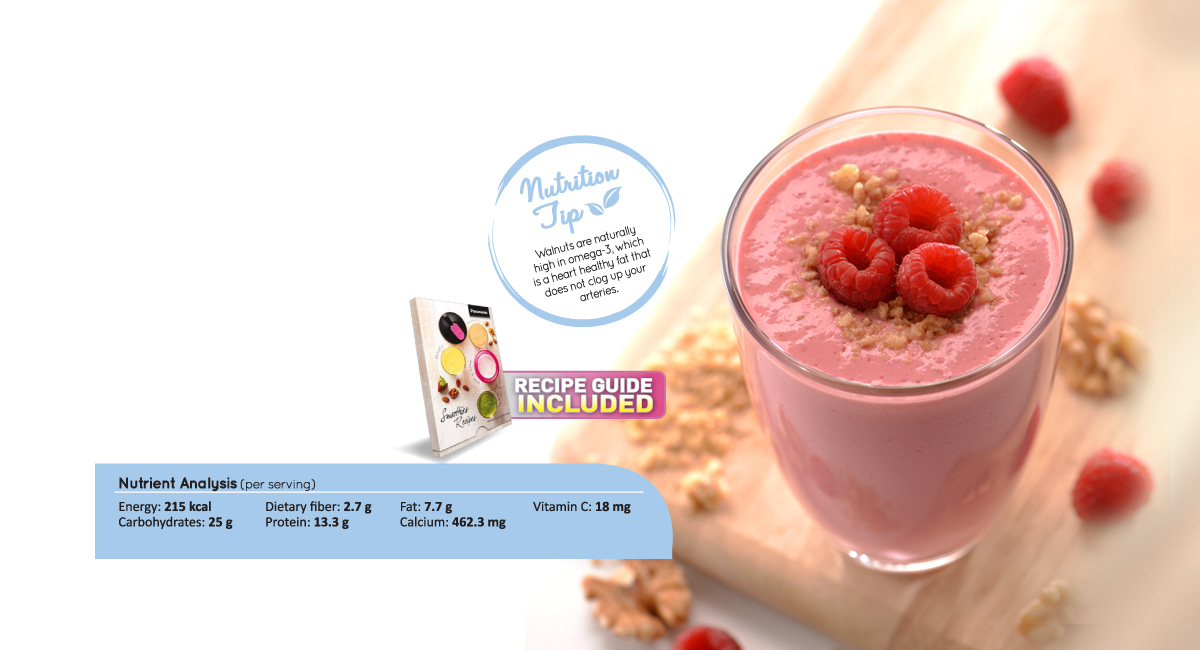・Place the non fat yogurt, low fat milk, ground walnuts, raspberries and honey (optional) into the blender.