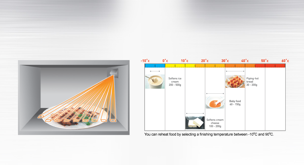 This high-performance sensor divides the inside of unit into 108 areas to accurately detect the surface temperature of food. You can also reheat food by selecting a finishing temperature between -10 °C and 90 °C. In addition, it also improved sensing accuracy detects the temperature in every part of the food to assure uniform heating.