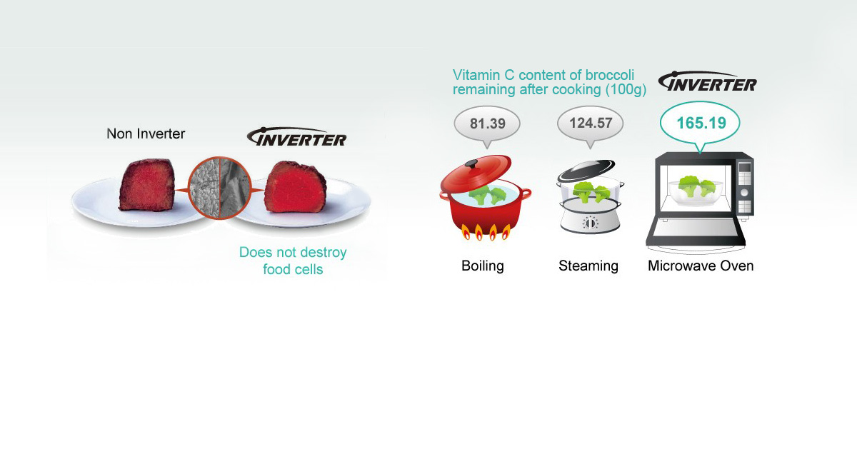 The cooking power and performance of a Panasonic Inverter Microwave oven has produced significant increases in nutrient levels of certain foods, when compared to other cooking methods such as boiling and steaming.* Not only will your food be ready fast, it will also contain the healthy nutrients you expect.