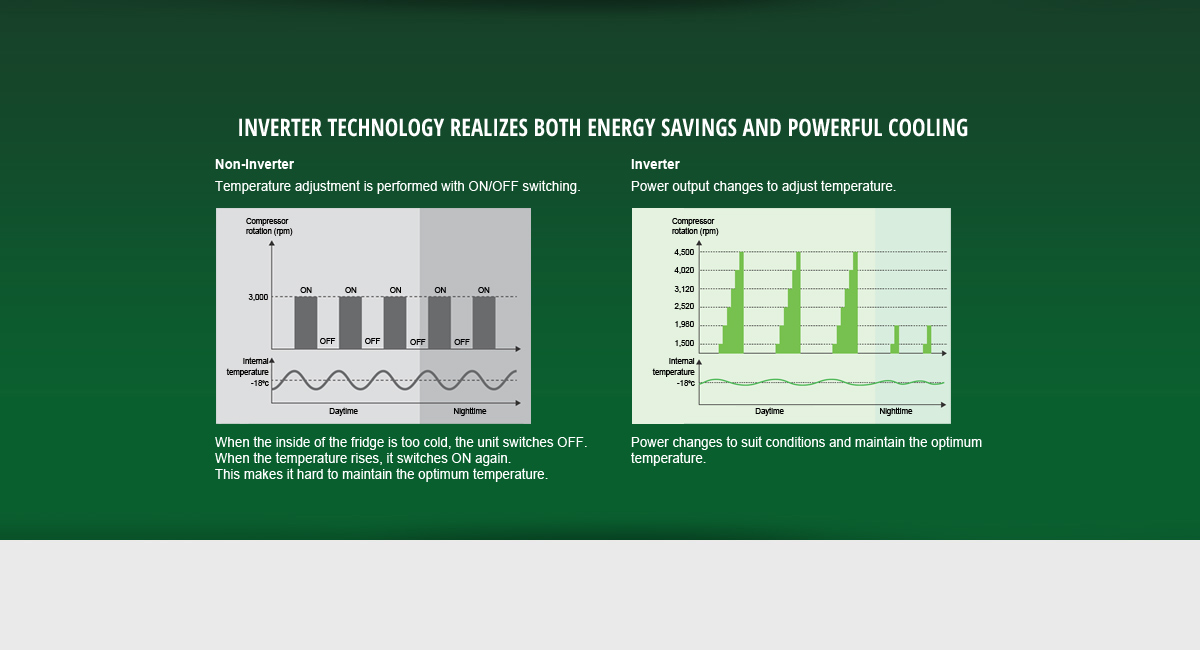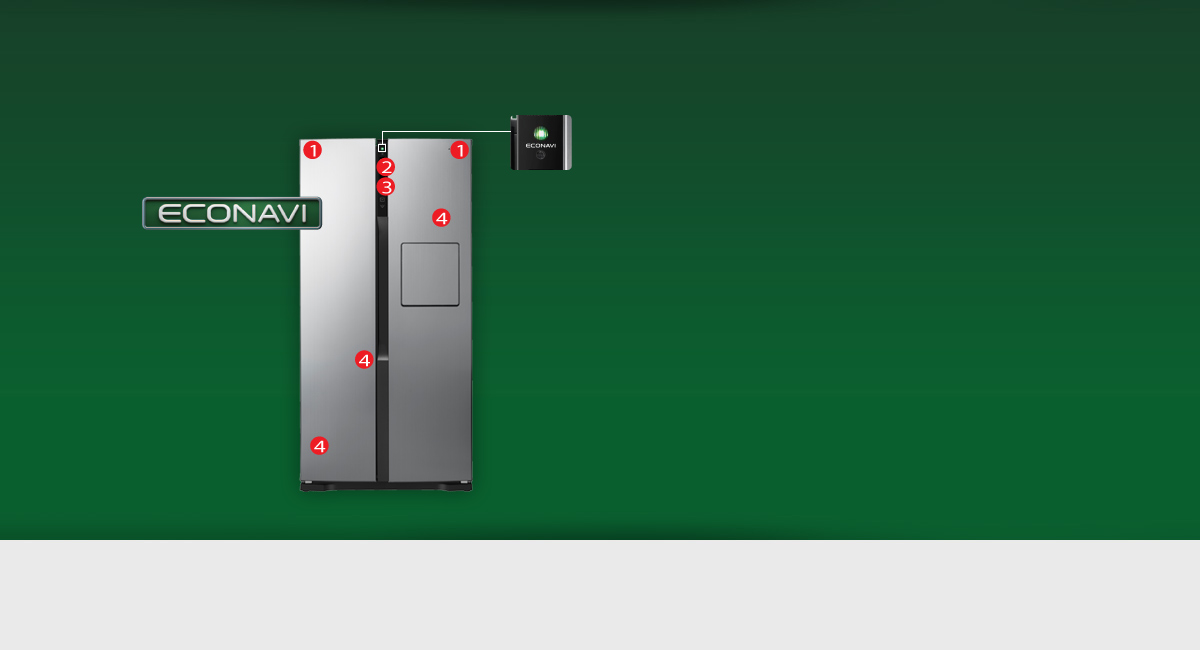 The ECONAVI refrigerator monitors the level of lighting and temperature in the room, when and how often the fridge doors are opened, and the fridge’s internal temperature. It analyzes and responds to this information to maintain ideal cooling and avoid wasting energy.