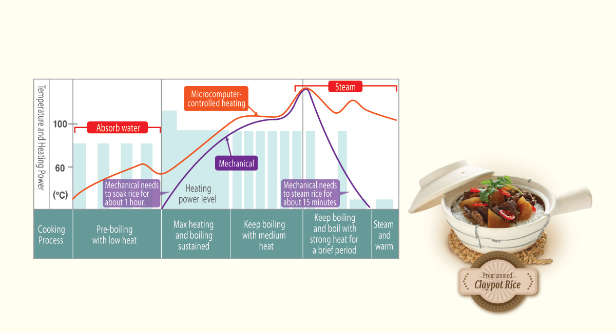 11 Cooking Programs: White Rice, Brown Rice, Sticky Rice, Quick Cook, Porridge, Steam, Soup, Slow Cook, Jasmine, Multi Grain, Claypot.