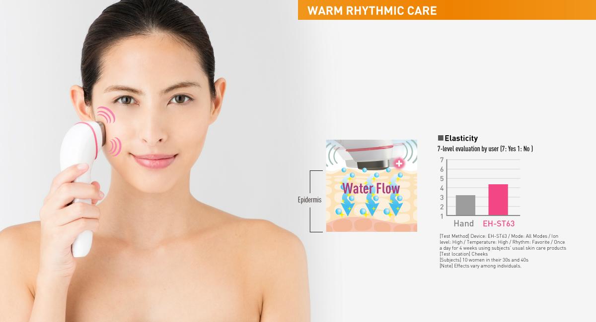Attach a cotton pad to the head and let it absorb the lotion. Grip the device on the Ion Panel from the rear and gently glide it. Water flow created by the movement of ions enhances the absorption of skin care products and delivers moisturizing ingredients deep inside the skin. The level of permeation of skin care products’ moisturizing ingredients using the EH-ST63 is 1.7 times more than when applied to the skin by hand.*
