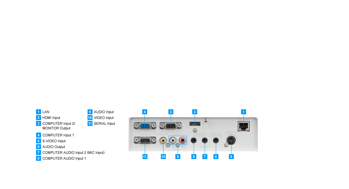 Extensive interfaces include an HDMI input terminal, 2 sets of computer (RGB) input terminals, a wired LAN terminal, and a serial (RS-232C) terminal for external control. These features support a wide range of system architectures for portable or ceiling mounted use.