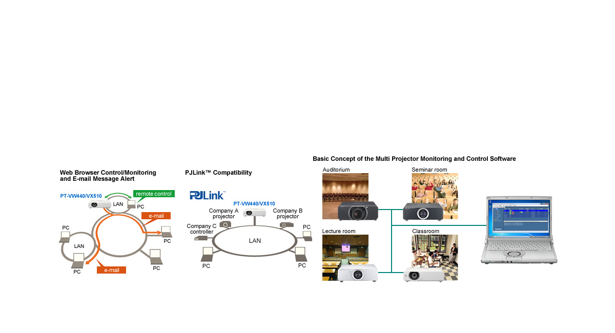 Web browser on a Computer connected through a wired LAN system lets you remotely operate Projectors and check their status. An e-mail messaging function can also notify you when a lamp needs replacement, and indicate the overall Projector status.