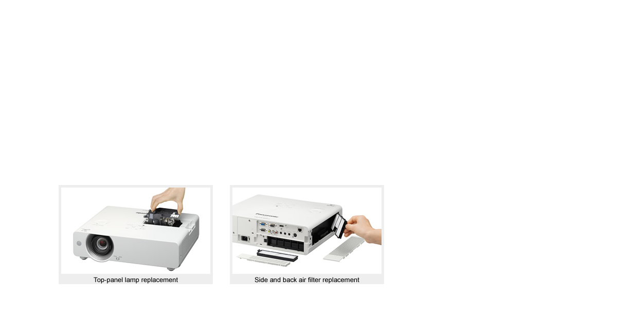 The PT-VX510EA have a maximum lamp replacement cycle of 4,000 hours. The air filters of the PT-VX510EA also have a replacement cycle of 4,000 hours.** This reduces maintenance hassles for long periods of use, and helps to lower maintenance costs and reduce environmental impact.