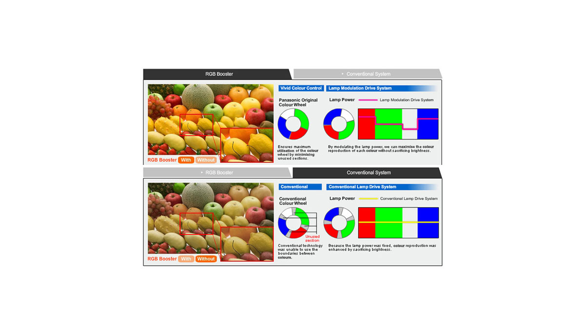 The RGB Booster achieves high image quality with levels of colour reproduction and brightness that make each colour stand out. It combines Panasonic's proprietary Vivid Colour Control technology with a newly engineered Lamp Modulation Drive System for a 1-chip DLP™ Projector that produces bright and vivid colours.