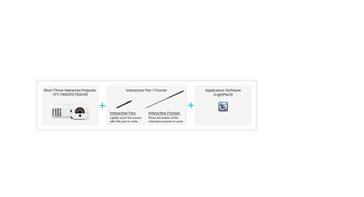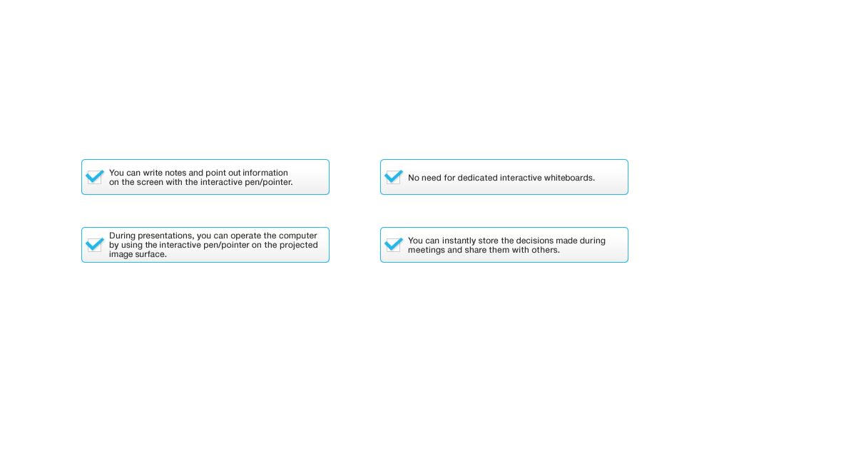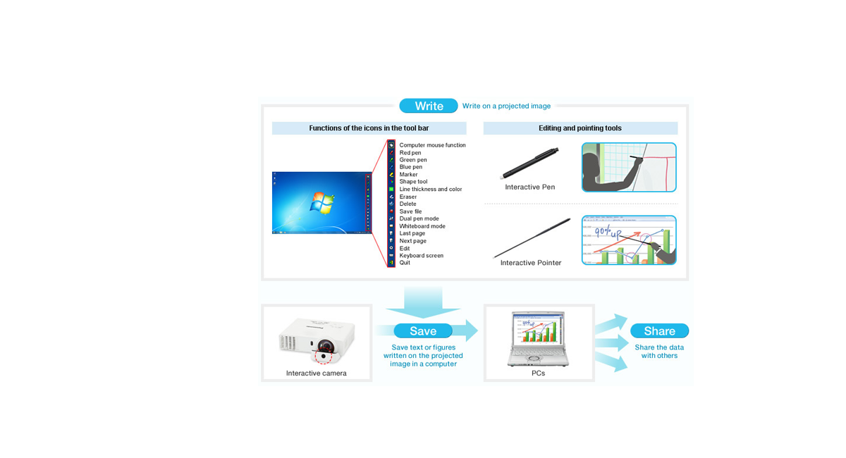 You can write or draw figures on the projected image with the Interactive Pen / Pointer. The scanning camera frame rate of the PT-TW331R / PT-TX301R is twice as high as that of our existing products**; ensures smoother writing. In addition, two users can write simultaneously, to make classes and presentations more effective. It is easy to store the words and figures in a computer for information sharing.