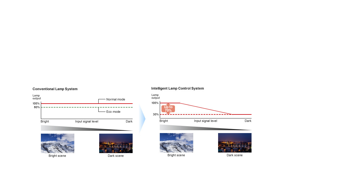 When the lamp power is set to AUTO, the Intelligent Lamp Control system automatically adjusts the lamp output in accordancewith the brightness of the projected image and reduces it by up to 70%.* It also combines with colour shift correction,which corrects the shift in the colour balance that occurs when the lamp output drops.