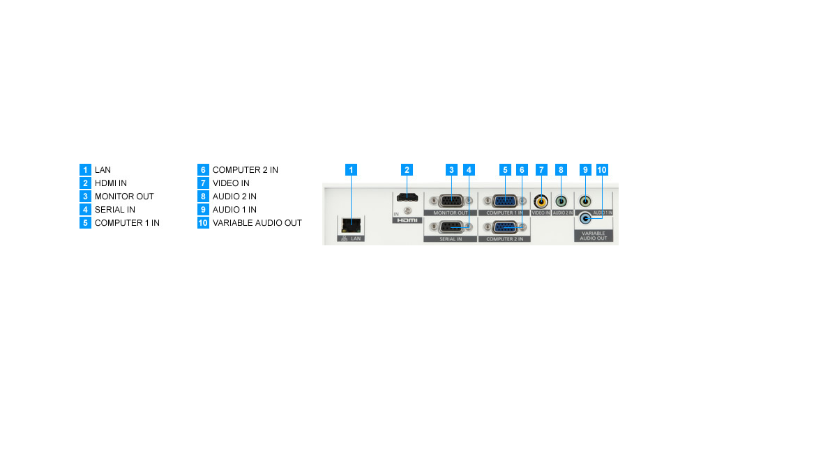 Extensive interfaces include an HDMI input terminal, 2 sets of computer (RGB) input terminals,