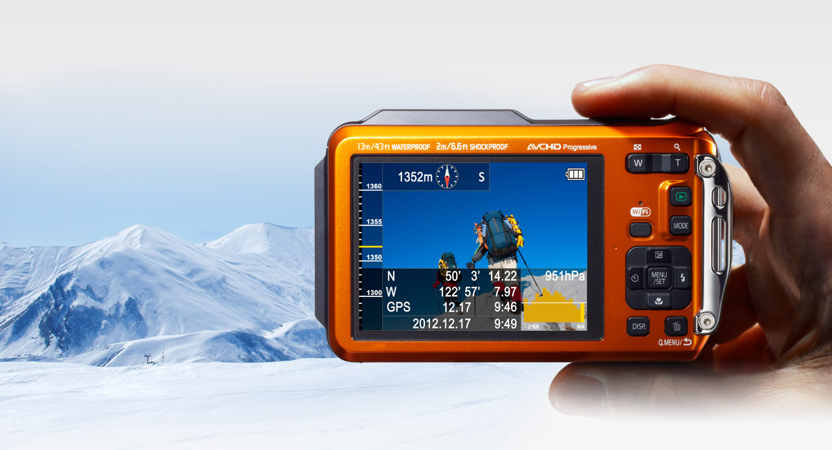 This camera is specially designed for active outdoor use. It adopts GPS, compass, altimeter and even barometer to show and record altitude, barometric pressure and orientation data. The barometer also works for indicator for depth underwater.