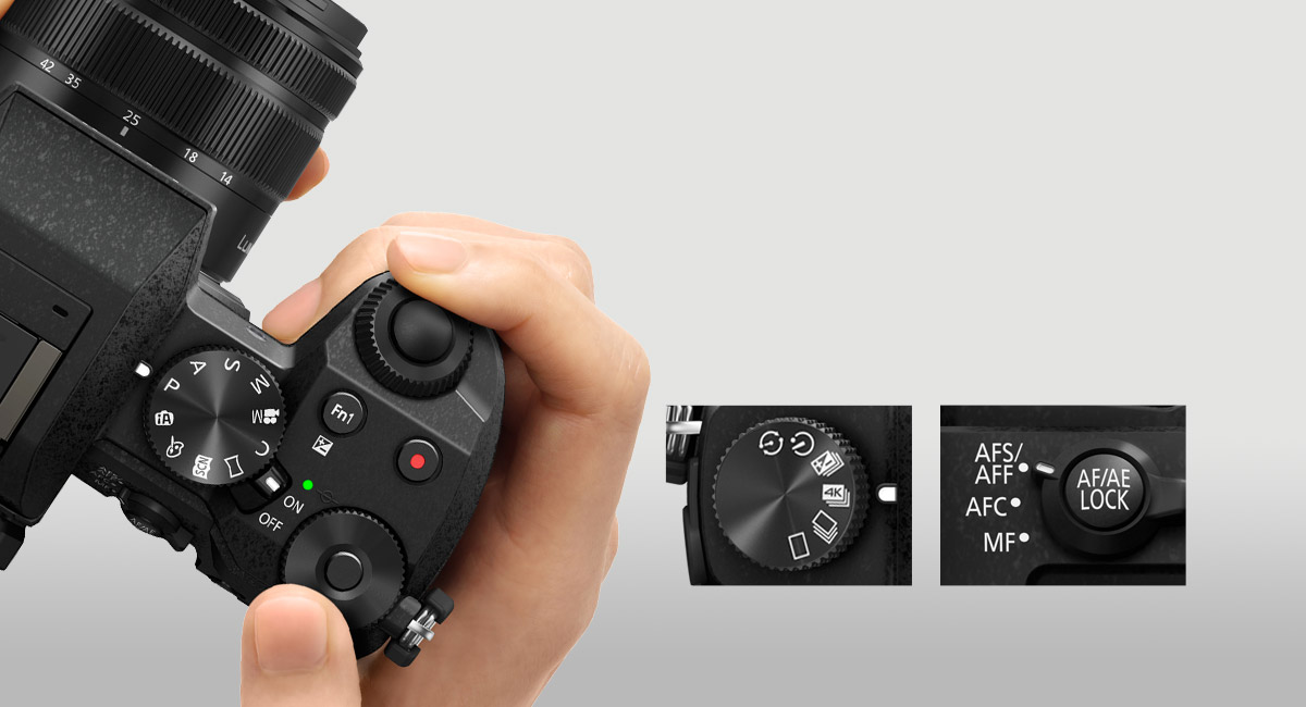 Not only does the LUMIX G7 feature a stylish, sophisticated body and a snug, hand-fitting grip, it also provides an intuitive level of operation. The Live View Finder (LVF) helps you frame your images even under bright sunlight conditions, and the body design lets you freely customise settings. The front/rear dials control the main aperture and shutter speed settings, while easily switching to handle temporary WB and ISO adjustments. Settings can also be assigned to six function buttons.* In addition, the 4K Photo mode can quickly be active by using the 4K Photo feature on the drive mode dial.