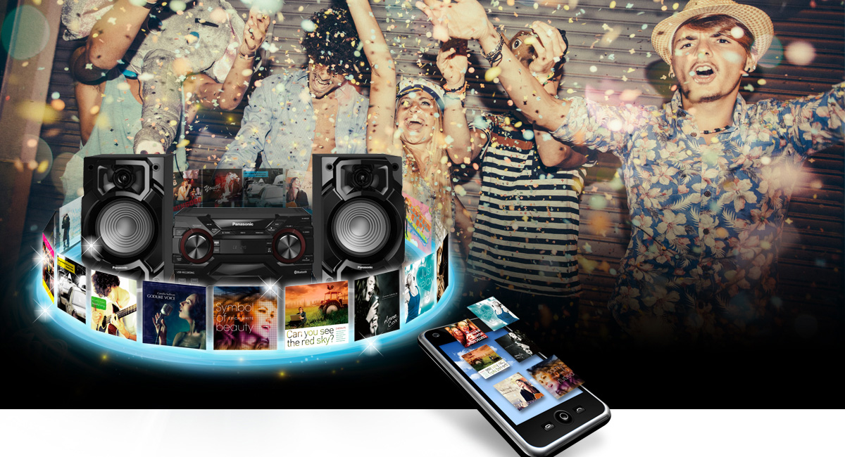 The DJ Jukebox plays songs from a USB device with Mix Play mode. Also, you can operate playlists and play requests through the Panasonic MAX Juke App.