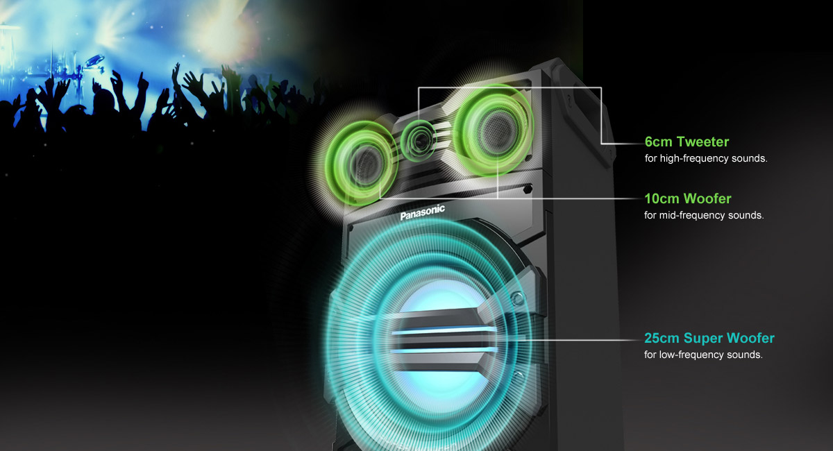 Clear, dynamic sound with a 25cm Super Woofer and Triple Amplifiers. This one-box mini system is all you need for indoor or outdoor use.