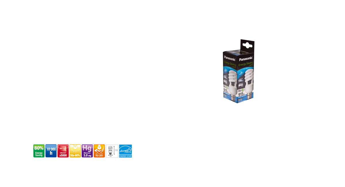 Panasonic's 14W compact fluorescent energy saving lamps deliver the same light output as a 75W incandescent lamp, saving more than 80% in power consumption. It also lasts for 10,000 hours.