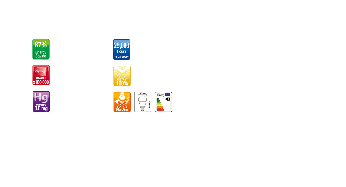 Energy and cost saving by using only 13% of energy to produce the same light output as a normal incandescent bulb.